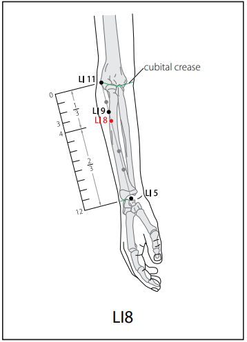 Note: LI8 is located at the junction of the upper one third and lower two thirds of the line connecting LI5 with LI11, 1 B-cun inferior to LI9.